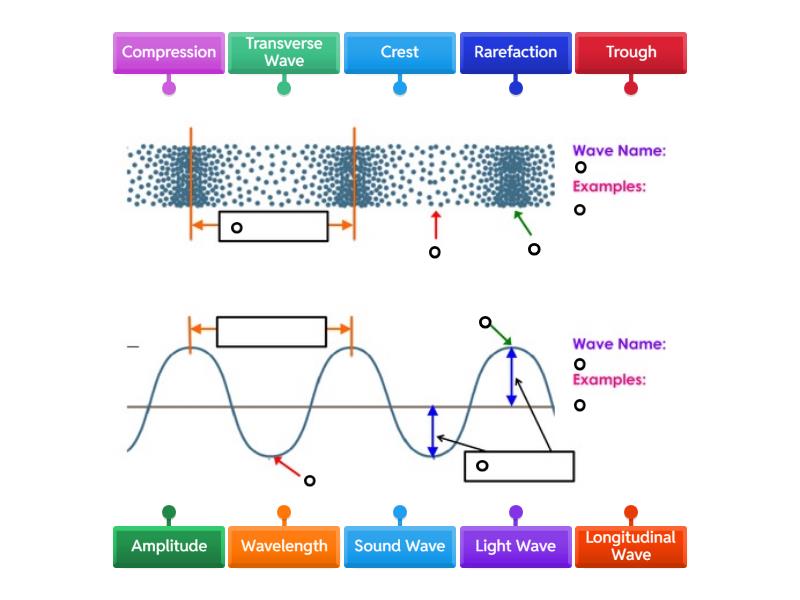 Crest, Trough, Wavelength, Amplitude, Compression, Rarefaction, Transverse Wave, Longitudinal Wave, Light Wave, Sound Wave.