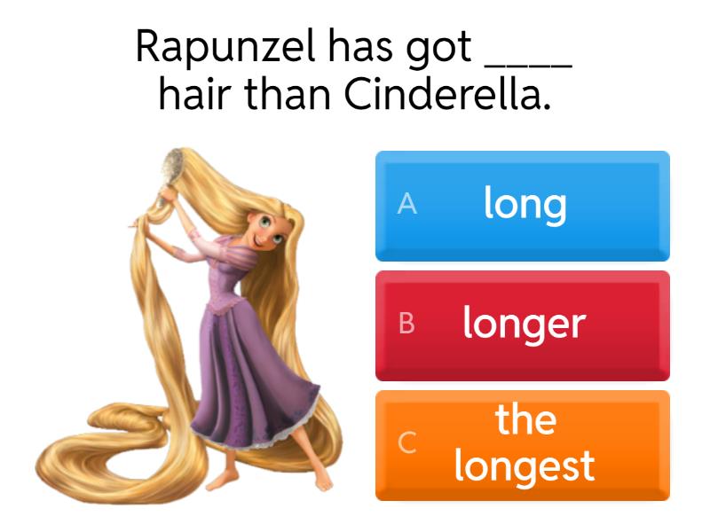 1) Rapunzel has got ____ hair than Cinderella. a) long b) longer c) the longest 2) Cinderella is ____ than her sisters. a) nice b) nicer c) the nicest 3) Pinocchio's nose is _____than Winnie`s . a) long b) longer c) the longest 4) Tiggar is ____ than Winnie. a) fast b) faster c) the fastest 5) Piglet is ____ friend than Tiggar. a) good b) better c) best 6) He is usually ____. a) sad b) sadder c) the saddest 7) McQueen is ____ than my car. a) fast b) faster c) fastest 8) Baloo is ____ than Bagheera. a) funny b) funnyer c) funnier 9) The puppy is _________ than the kitten. a) big b) bigger c) the biggest 10) Summer is _______ than spring. a) hot b) hotter c) the hottest 11) He is ________ than his sister. a) old b) older c) the oldest 12) He is a _______ pupil than me. a) bad b) worse c) the worst