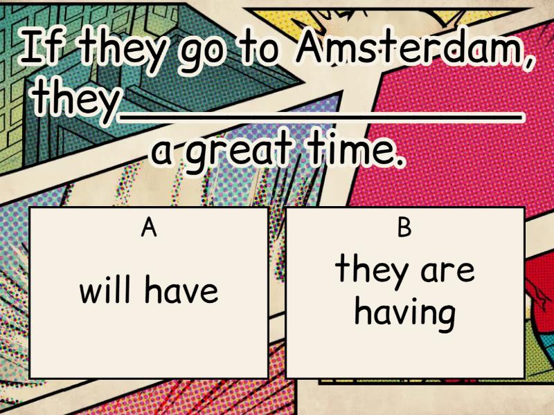 1) If they go to Amsterdam, they_______________ a great time. a) will have b) they are having 2) If you're buying a new outfit for the party,__________ one too. a) I get b) I'm getting 3) If you get out of school before me, __________ for me at the bus stop. a) you'll wait b) wait 4) If we don't hurry up, we _________ this exercise by the end of the lesson. a) won't have finished b) won't be finishing 5) If he gets good grades, my brother ________ to university. a) goes b) will go 6) If this DVD's any good, ________ it to you. a) have lent b) I'll lend 7) I'll let you know _______ I've booked my ticket. a) as soon as b) while 8) If it stays hot, the clothes will have dried __________ we leave. a) unless b) by the time 9) My parents will let me go camping _____________ I phone every day a) once b) on condition that 10) _________ she lands in New York, she'll have been travelling for two days. a) By the time b) In case 11) ______ you need anything, just ask at reception. a) If b) Unless
