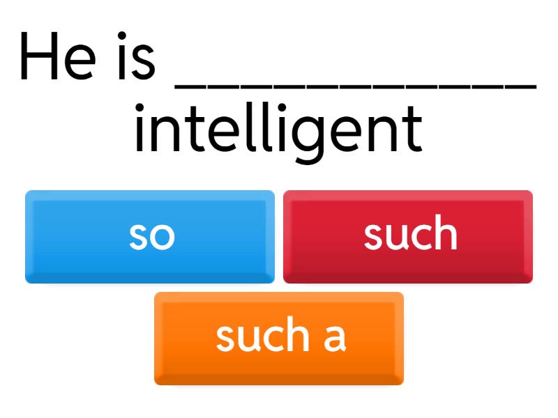 1) He is ___________ intelligent a) so b) such c) such a 2) It was ___________ great party! a) such b) such a c) so 3) They're _____________ nice people a) such b) such a c) so 4) The test was ____________ hard! a) such b) so c) such a 5) It was __________ fast car! a) such a b) such c) so 6) Jessi and Cristian are _____________ amazing students a) such a b) so c) such 7) I'm having _________ bad time in Melbourne a) such a b) such c) so 8) The restrictions in Melbourne are ________ strict! a) so b) such a c) such 9) Water is __________ important for you. a) so b) such a c) such 10) These questions are _______ easy. a) so b) such c) such a 11) It's ___________ nice day. a) such a b) such c) so 12) It's nice to have ____________ warm weather. a) such a b) such c) so 13) Stefania is __________ beautiful girl. a) such a b) such c) so 14) The teachers at Greenwich are _________ stressed. a) so b) such c) such a