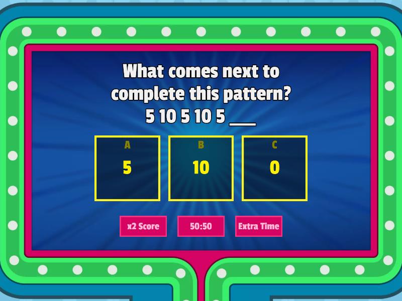 1) What comes next to complete this pattern? 5 10 5 10 5 ___ a) 5 b) 10 c) 0 2) Complete the pattern. Y O U Y ___ U a) O b) U c) Y 3) What do you call the patterns in which shapes numbers, objects and images are arranged in a particular order and repeated over and over again. a) Growing Patterns b) Shirking Patterns c) Repeated patterns