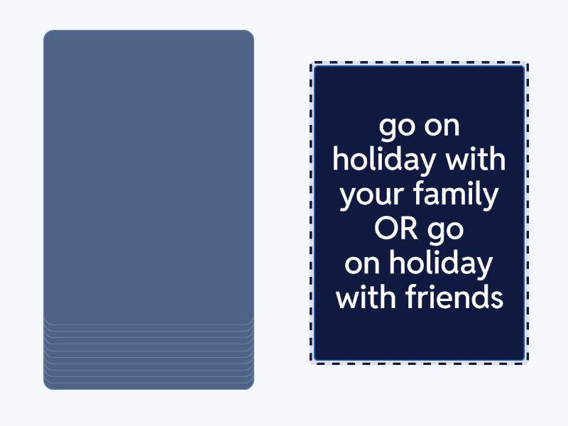 go on holiday with your family OR go on holiday with friends, watch a film in your native language OR watch a film with English subtitles, watch a film in the cinema OR watch a film at home, spend time on your own OR hang out with friends, do English homework OR do the housework, wash the dishes OR mop the floor, go shopping on your own OR go shopping with friends, do martial arts OR do yoga, watch a documentary OR watch a reality show, live in a bustling city OR settle in a quiet village?, spend a weekend on a school trip OR to stay at home and recharge your batteries?, have extra maths lessons or to have extra English lessons.