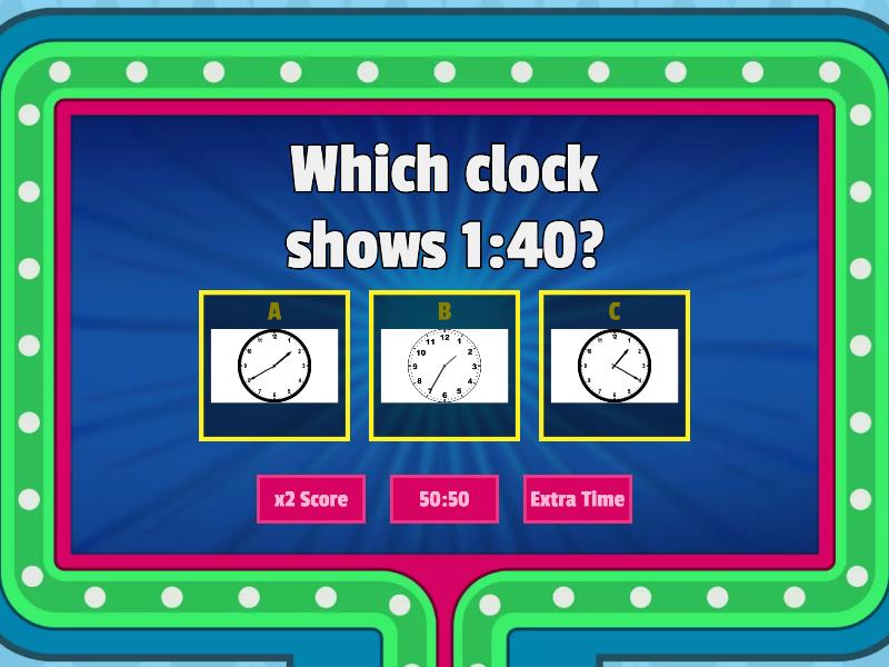 1) Which clock shows 1:40? a) b) c) 2) Which clock shows 10:55 a) b) c) 3) Which clock shows 4:35 a) b) c) 4) Which clock shows 7:50? a) b) c) 5) Which clock shows 2:40? a) b) c) 6) Which clock shows 3:45? a) b) c) 7) Which clock shows 12:50 a) b) c) 8) Which clock shows 6:45 a) b) c) 9) Which clock shows 2:35? a) b) c) 10) Which clock shows 1:05? a) b) c)