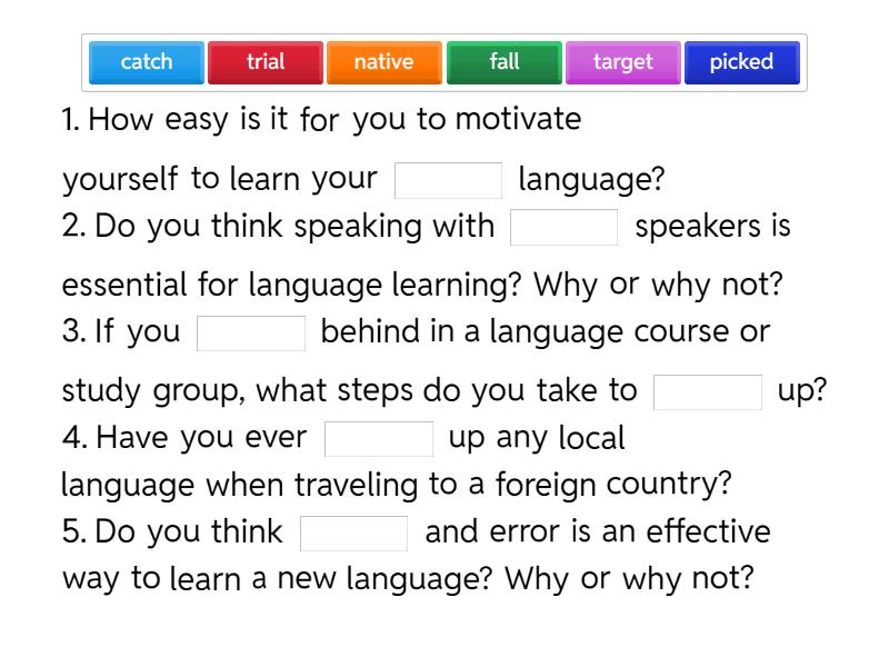 1. How easy is it for you to motivate yourself to learn your ____ language? 2. Do you think speaking with ____ speakers is essential for language learning? Why or why not? 3. If you ____ behind in a language course or study group, what steps do you take to ____ up? 4. Have you ever ____ up any local language when traveling to a foreign country? 5. Do you think ____ and error is an effective way to learn a new language? Why or why not?