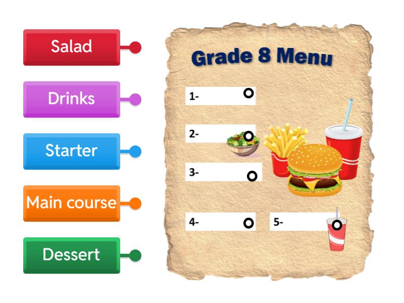 Starter, Salad, Main course, Dessert, Drinks.