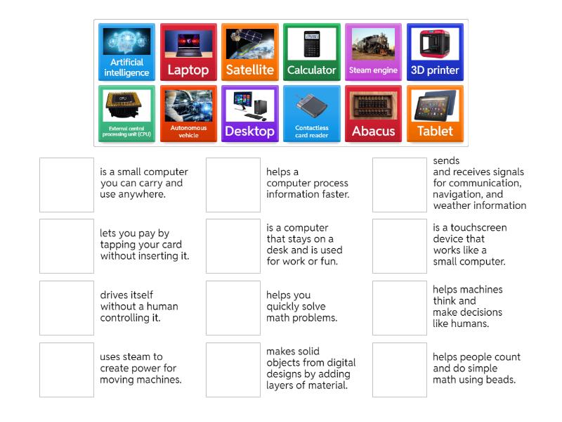 Satellite - sends and receives signals for communication, navigation, and weather information, Autonomous vehicle - drives itself without a human controlling it., Artificial intelligence - helps machines think and make decisions like humans., Abacus - helps people count and do simple math using beads., Laptop - is a small computer you can carry and use anywhere., 3D printer - makes solid objects from digital designs by adding layers of material., Contactless card reader - lets you pay by tapping your card without inserting it., Steam engine - uses steam to create power for moving machines., Calculator - helps you quickly solve math problems., Desktop - is a computer that stays on a desk and is used for work or fun., External central processing unit (CPU) - helps a computer process information faster., Tablet - is a touchscreen device that works like a small computer.,