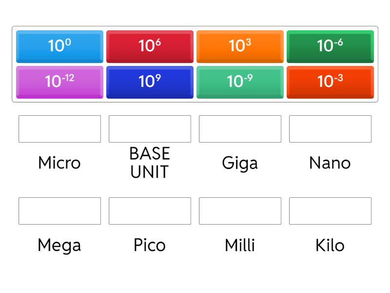109 - Giga, 106 - Mega, 103 - Kilo, 100 - BASE UNIT, 10-3 - Milli, 10-6 - Micro, 10-9 - Nano, 10-12 - Pico,