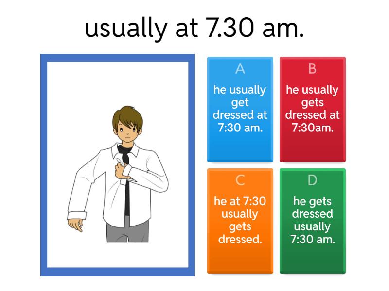 1) usually at 7.30 am. a) he usually get dressed at 7:30 am.  b) he usually gets dressed at 7:30am. c) he at 7:30 usually gets dressed. d) he gets dressed usually 7:30 am. 2) often early. a) he often wakes up early. b) he early wakes up often c) he often is wake up at 7:30am d) he often early wake up. 3) always at 7:45am a) he always brush his teeth at 7:45am.  b) he brushes his teeth always at 7:45am.  c) he always brushes his teeth at 7:45 am. d) he always at 7:45 brush his teeth. 4) often before 11:30pm a) he goes to bed always before 11:30pm. b) he often go to bed before 11:30pm. c) he often goes to bed 11:30pm before.  d) he often goes to bed before 11:30pm 5) never a) he never have breakfast. b) he has breakfast never c) he never has breakfast. d) he has never breakfast. 6) usually at 6:30 evening a) he usually has dinner in the evening at 6:30 b) he usually has dinner at 6:30 in the evening. c) he have dinner in the evening usually. d) he has usually dinner at 6:30 in the evening. 7) sometimes late. a) he sometimes leaves home late b) he sometimes leave home late. c) he late sometimes leaves home. d) he sometimes leaves late home. 8) sometimes at night a) he sometime has a bath night. b) he sometimes has a bath at night. c) he sometimes at night has a bath. d) at night sometimes he has a bath. 9) always in the morning. a) He always wash his face the morning b) he always in the morning his face washes. c) he always washes his face in the morning d) he always wash his face in the morning. 10) never in the afternoon. a) He never reads a book in the afternoon.  b) He is never read a book in the afternoon. c) He never in the afternoon reads a book. d) He in the afternoon read never a book.
