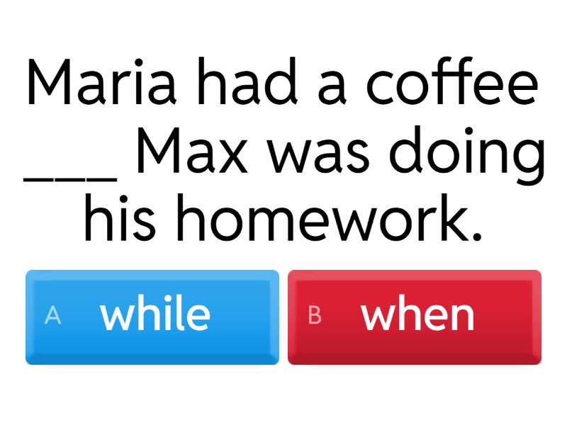 1) Maria had a coffee ___ Max was doing his homework. a) while b) when 2) We were walking home ______ we saw the fire a) while b) when 3) _____ the plane landed, Elena was waiting at the airport. a) while b) when 4) _____ Richard was checking the map, I got some petrol. a) while b) when