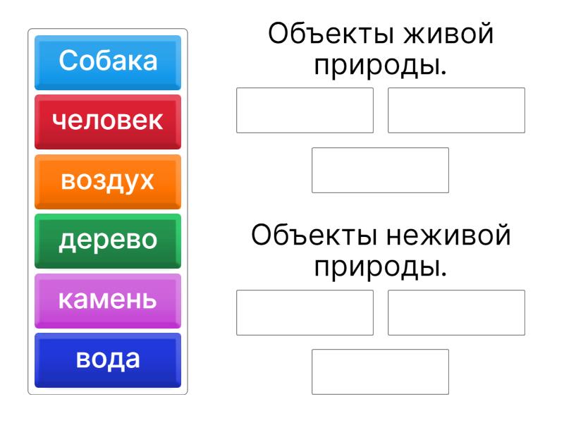 Объекты живой природы.: человек, дерево, Собака, Объекты неживой природы.: камень, вода, воздух,