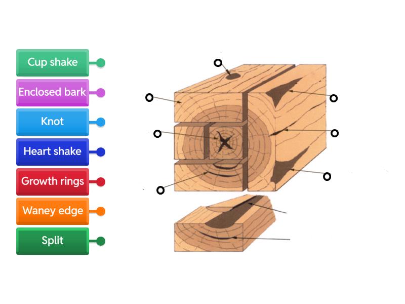 Knot, Growth rings, Waney edge, Split, Enclosed bark, Heart shake, Cup shake.