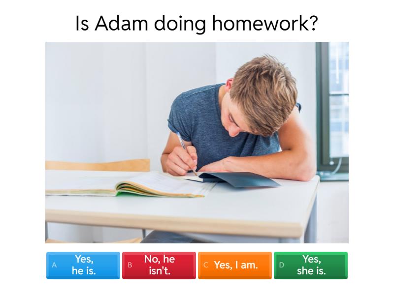 1) Is Adam doing homework? a) Yes, he is. b) No, he isn't. c) Yes, I am. d) Yes, she is. 2) Is Betty listening to music? a) No, she isn't. b) Yes, you are. c) Yes, she is. d) No, he isn't. 3) Is the dog riding a bike? a) Yes, it is. b) Yes, he is. c) No, he/it isn't. 4) Is Ariana reading a book? a) No, she isn't. b) Yes, she is. c) No, he isn't. d) Yes, he is. 5) Is the cat sleeping? a) Yes, it is. b) Yes, she is. c) No, he/it isn't. 6) Are the elephants running? a) No, we aren't. b) No, you aren't. c) No, they aren't. d) No, it isn't. 7) Gina: Are you watching a film, Hannah? a) Hannah: Yes, I am. b) Hannah: Yes, you are. c) Hannah: Yes, she is. d) Hannah: No, you aren't. 8) Are the boys eating sandwiches? a) Yes, we are. b) No, we aren't. c) No, you aren't, d) No, they aren't. 9) Is Jake juggling? a) Yes, he is. b) Yes, it is. c) Yes, she is. d) No, he isn't. 10) Are the kangaroos jumping? a) No, they aren't. b) Yes, we are. c) Yes, you are. d) Yes, they are.