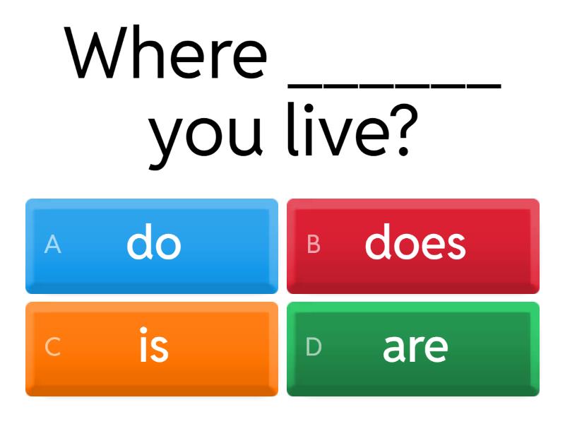 1) Where ______ you live? a) do b) does c) is d) are 2) Who _____ she live with? a) do b) does c) is d) are 3) How often do you go to the gym? a) At 10 o'clock b) Because I like exercise c) Once a week d) In Catterick 4) Where do you study English? a) 9:30am to 12:30pm b) On Tuesdays and Thursdays c) At the Swaledale Mountain Rescue Centre d) With my friends 5) Who do you live with? a) on Monday b) in my house c) at 10 o'clock d) I live with my family 6) Who ______ she? a) am b) is c) are d) do 7) What ... your favourite colour?  a) do b) does c) are d) is 8) What time do you usually get up?  a) to learn English b) 3 times a week c) About 7am d) in Peterborough 9) Where _______ he live? a) is b) are c) do d) does 10) ___ you take the bus to Darlington?  a) Does b) Do c) Are d) Is
