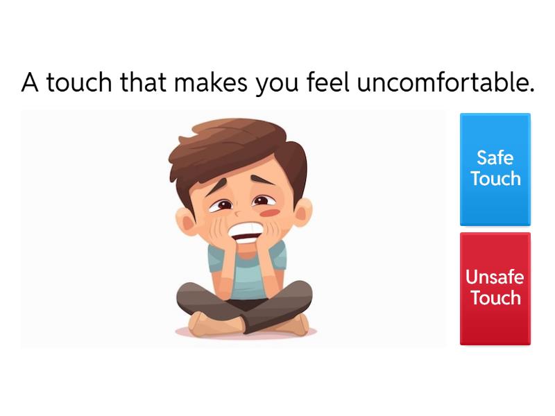 1) A touch that makes you feel uncomfortable. a) Safe Touch b) Unsafe Touch 2) A ___________ touch means love, care and help. a) Safe b) Unsafe 3) Elbow bump a) Safe Touch b) Unsafe Touch 4) A stranger trying to hold your hand a) Safe Touch b) Unsafe Touch 5) A doctor examining you when your parents are not there is. a) Safe touch b) Unsafe touch 6) A close friend braids your long hair a) Safe touch b) Unsafe touch 7) A classmate keeps touching your shoulder or back, even when you move away. a) Safe touch b) Unsafe touch 8) You feel gross or anxious after someone touches you, even if they said it was “just a joke.” a) Safe touch b) Unsafe touch 9) Someone keeps touching your personal belongings without permission and says you're "overreacting." a) Safe touch b) Unsafe touch 10) After asking, you rest your head on a friend's shoulder during a movie a) Safe touch b) Unsafe touch