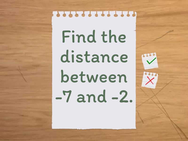 What is the distance between -3 and 5? - 8, Find the distance between -7 and -2. - 5, What is the distance between -10 and 3? - 13, Find the distance between 0 and -8. - 8, Find the distance between -8 and 2. - 10, What is the distance between -12 and -3? - 9, What is the distance between 7 and -2? - 9, Find the distance between -15 and 5. - 20, What is the distance between 17 and -3? - 20, The temperature was -18°F in the morning but rose to 9°F by the afternoon. What is the temperature difference? - 27, A person starts at -13 on a number line and moves to 4. How far did they travel? - 17, A company’s stock was at -7 points yesterday and increased to 14 points today. What is the total change? - 21, What is the distance between -7.9 and 5.2? - 13.1, How far apart are 3.17 and -1.92? - 5.09, Find the distance between -4.25 and 2.75. - 7,
