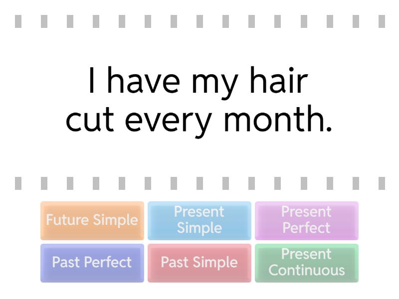 Present Simple - I have my hair cut every month., Past Simple - She had her phone fixed yesterday., Future Simple - They will have their house painted next summer., Present Continuous - He is having his car repaired now., Present Perfect - We have had our kitchen renovated recently., Past Perfect - He had had his watch repaired before the trip.,