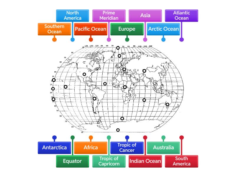North America, South America, Africa, Europe, Asia, Antarctica, Australia, Pacific Ocean, Atlantic Ocean, Arctic Ocean, Indian Ocean, Southern Ocean, Equator, Prime Meridian, Tropic of Cancer, Tropic of Capricorn.