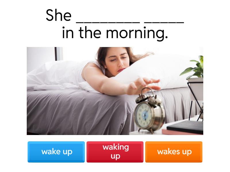 1) She ________ _____ in the morning. a) wake up b) waking up c) wakes up 2) I _____ _____ early. a) get up b) gets up c) getting up 3) The woman _______ a shower at 6 o'clock. a) having  b) have c) has 4) I ________ ____ teeth at half past six. a) brush her b) brush your c) brush my 5) The man ______ breakfast in the morning. a) make b) makes c) making 6) She _______ ______ tea. a) drinks his b) drinks my c) drinks your d) drinks her 7) The boy _____ _______ in the afternoon. a) goes jogging b) go jogging c) going jogging 8) I _______ a book in the afternoon. a) reading b) read c) reads 9) The girl ________ dinner in the evening. a) cooking b) cooks c) cook 10) The boy _________ TV in the evening. a) watches b) watch c) watching 11) I _____ to bed late. a) goes b) going c) go