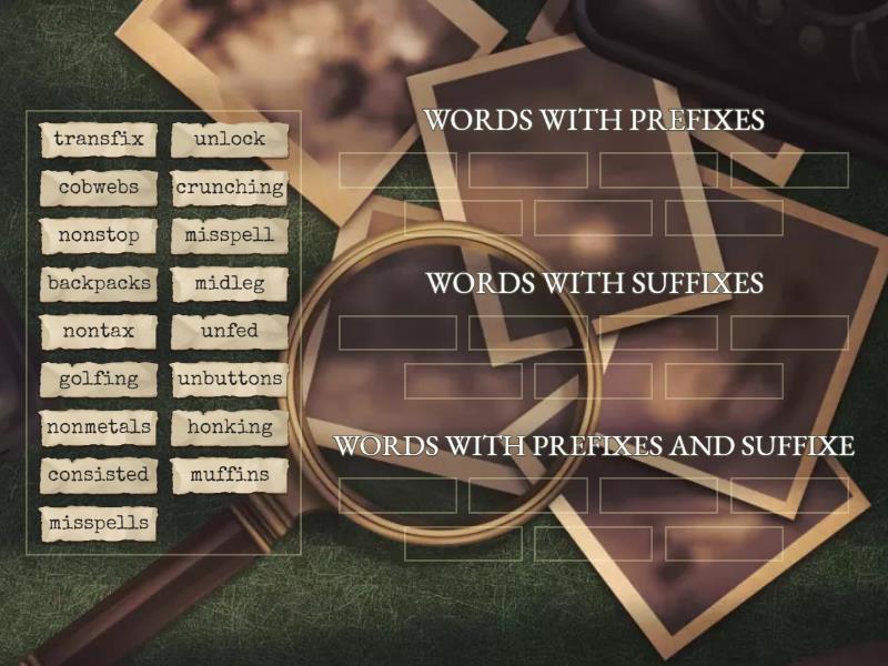WORDS WITH PREFIXES: unfed, transfix, nontax, unlock, midleg, nonstop, misspell, WORDS WITH SUFFIXES: cobwebs, muffins, backpacks, honking, crunching, golfing, consisted, WORDS WITH PREFIXES AND SUFFIXE: misspells, unbuttons, nonmetals,