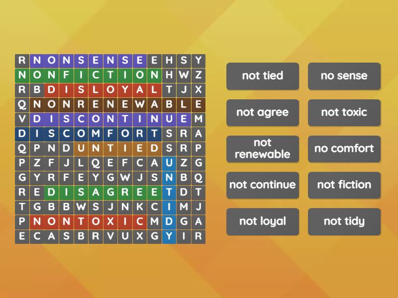 disagree - not agree, nonsense - no sense, disloyal - not loyal, untidy - not tidy, nonrenewable - not renewable, discomfort - no comfort, untied - not tied, nonfiction - not fiction, discontinue - not continue, nontoxic - not toxic,