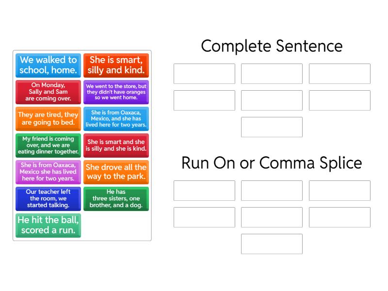 Complete Sentence: We went to the store, but they didn't have oranges so we went home., My friend is coming over, and we are eating dinner together., On Monday, Sally and Sam are coming over., He has three sisters, one brother, and a dog. , She drove all the way to the park., She is from Oaxaca, Mexico, and she has lived here for two years. , She is smart, silly and kind., Run On or Comma Splice: Our teacher left the room, we started talking., We walked to school, home., She is smart and she is silly and she is kind., They are tired, they are going to bed., He hit the ball, scored a run., She is from Oaxaca, Mexico she has lived here for two years. ,