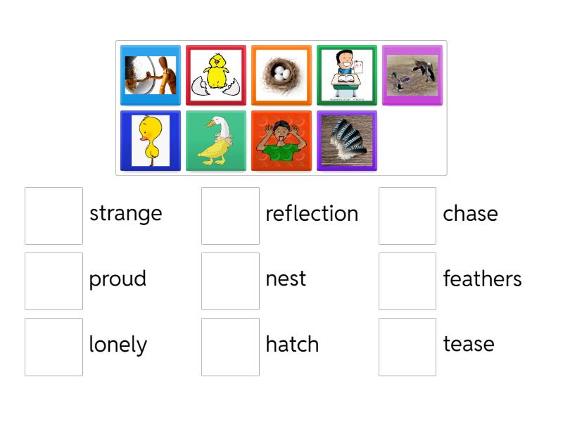 reflection, nest, feathers, hatch, strange, tease, lonely, proud, chase,