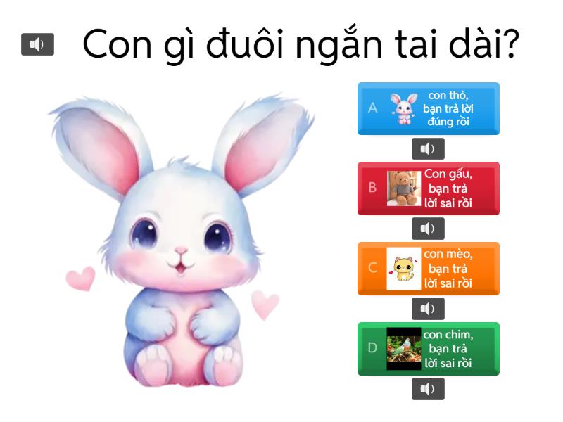 1) Con gì đuôi ngắn tai dài? a) con thỏ, bạn trả lời đúng rồi b) Con gấu, bạn trả lời sai rồi c) con mèo, bạn trả lời sai rồi d) con chim, bạn trả lời sai rồi