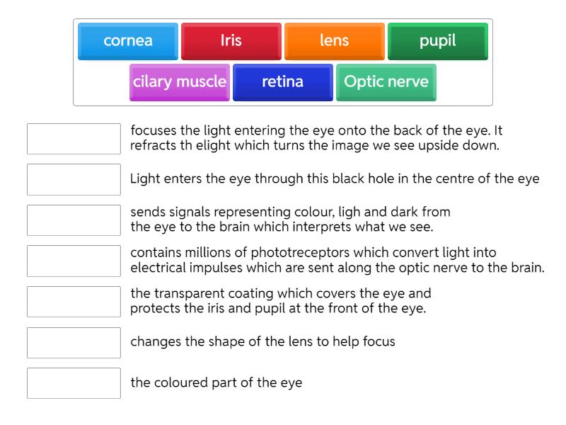 pupil - Light enters the eye through this black hole in the centre of the eye, Iris - the coloured part of the eye, lens - focuses the light entering the eye onto the back of the eye. It refracts th elight which turns the image we see upside down., cornea - the transparent coating which covers the eye and protects the iris and pupil at the front of the eye., cilary muscle - changes the shape of the lens to help focus, retina - contains millions of phototreceptors which convert light into electrical impulses which are sent along the optic nerve to the brain., Optic nerve - sends signals representing colour, ligh and dark from the eye to the brain which interprets what we see.,