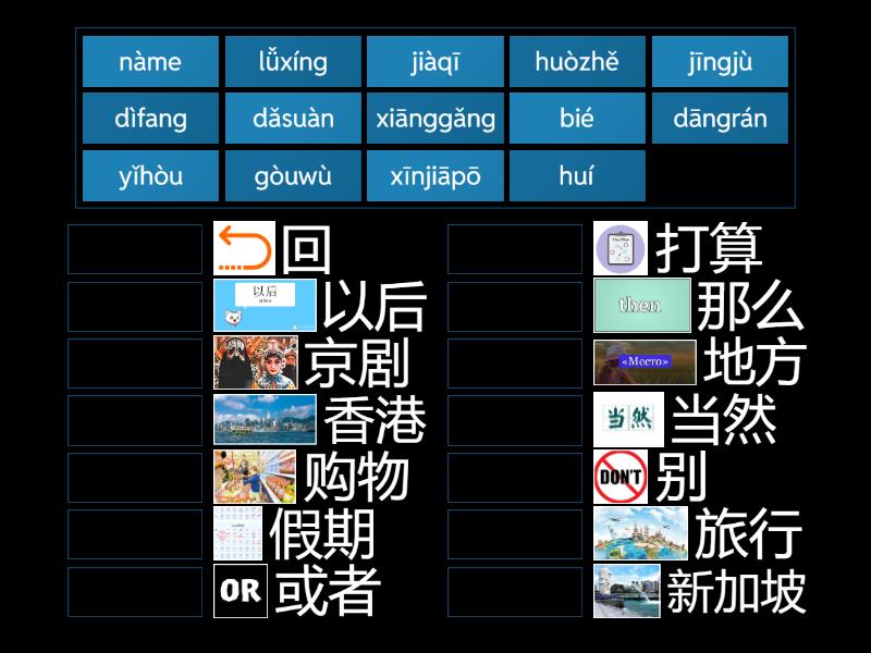 dǎsuàn - 打算, huòzhě - 或者, huí - 回, bié - 别, dìfang - 地方, xīnjiāpō - 新加坡, xiānggǎng - 香港 , nàme - 那么, yǐhòu - 以后, jīngjù - 京剧, gòuwù - 购物, lǚxíng - 旅行, dāngrán - 当然, jiàqī - 假期,