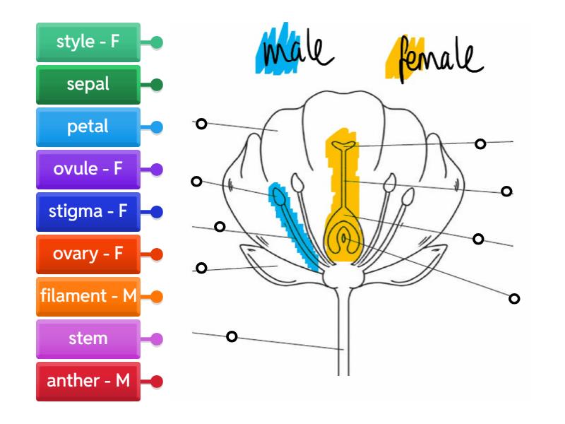 petal, anther - M, filament - M, sepal, stem, stigma - F, style - F, ovary - F, ovule - F.