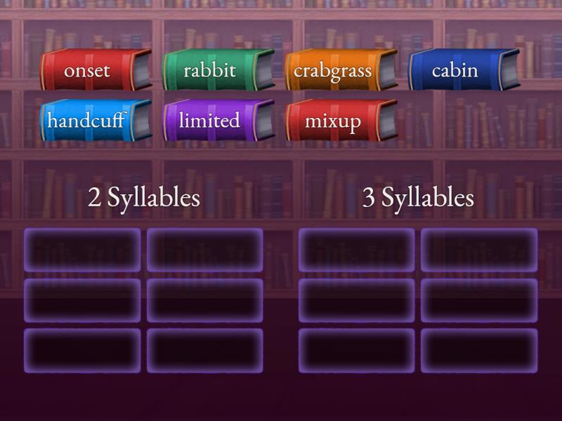 2 Syllables: cabin, crabgrass, handcuff, mixup, onset, rabbit, 3 Syllables: limited,