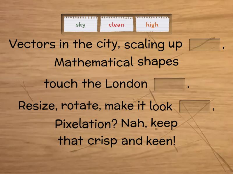 Vectors in the city, scaling up ____, Mathematical shapes touch the London ____. Resize, rotate, make it look ____, Pixelation? Nah, keep that crisp and keen! Big Ben’s ticking, the lines stay ____, Fill in the Thames, make it bold and ____. Raster’s rough, but vectors stay ____, London’s calling—so design it ____