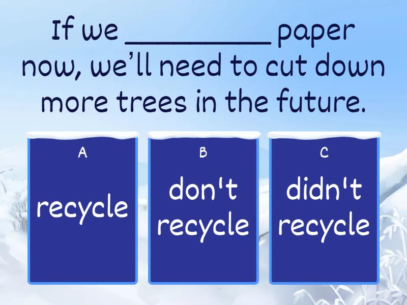 1) If we _________ paper now, we’ll need to cut down more trees in the future. a) recycle b) don't recycle c) didn't recycle 2) If the local people _________ fresh water, they wouldn’t have to use polluted water. a) have b) had c) didn't recycle 3) What _______ if radioactive material was not handled properly? a) happen b) will happen c) would happen 4) If we recycle more household waste, there ______ less damage to the environment. a) won't recycle b) didn't be c) will recycle 5) If we ______ environmental problems, we would not be able to do anything about them. a) don't understand b) didn't understand c) understood 6) If the polar ice-caps melted completely, Sea levels worldwide ______ about 60 metres. a) will rise b) wouldn't rise c) would rise 7) The amount of plastic in the ocean _________ if we __________ action now. a) increase/ won't take b) will increase/ don't take c) increased/ would take 8) These fish __________ if the factory ________ its toxic waste into the river. a) won't die/ don't dump b) didn't die/ wouldn't dump c) wouldn't die/ didn't dump 9) There ______ enough oxygen if we _____ the rainforests. a) will be/ don't protect b) won't be/ don't protect c) wouldn't be/didn't protect 10) If I _______ the President, I _______ billboards in cities in order to reduce visual pollution. a) weren't/ would ban b) am/will ban c) were/ would ban