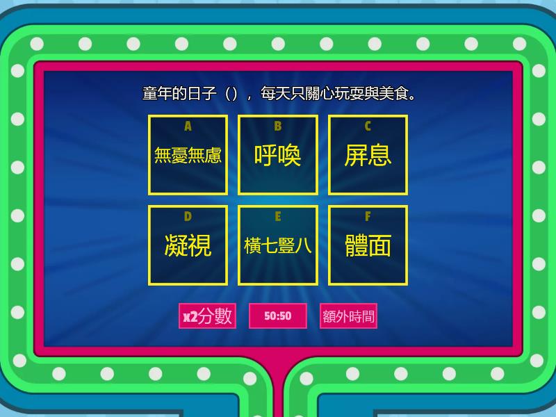 1) 童年的日子(),每天只關心玩耍與美食。 a) 無憂無慮 b) 呼喚 c) 屏息 d) 凝視 e) 橫七豎八 f) 體面 2) 夜晚,他站在門口()著愛犬,卻久久沒有回應。 a) 無憂無慮 b) 呼喚 c) 屏息 d) 凝視 e) 橫七豎八 f) 體面 3) 觀眾()凝視舞台,期待著魔術師下一步的驚喜。 a) 無憂無慮 b) 呼喚 c) 屏息 d) 凝視 e) 橫七豎八 f) 體面 4) 她靜靜地()著窗外的細雨,思緒飄向遙遠的過去。 a) 無憂無慮 b) 呼喚 c) 屏息 d) 凝視 e) 橫七豎八 f) 體面 5) 房間裡的書本()地堆著,看起來雜亂無章。 a) 無憂無慮 b) 呼喚 c) 屏息 d) 凝視 e) 橫七豎八 f) 體面 6) 表哥穿著一身西裝出席宴會,顯得格外()大方。 a) 無憂無慮 b) 呼喚 c) 屏息 d) 凝視 e) 橫七豎八 f) 體面 7) 小青()地走上舞台,自信地展現自己的才華。 a) 無憂無慮 b) 呼喚 c) 昂首闊步 d) 凝視 e) 橫七豎八 f) 體面 8) 這座荒地經過多年的努力,終於被()成美麗的公園。 a) 無憂無慮 b) 呼喚 c) 昂首闊步 d) 凝視 e) 開闢 f) 遭殃 9) 連日豪雨導致河水暴漲,低窪地區的農田全都()了。 a) 無憂無慮 b) 呼喚 c) 昂首闊步 d) 凝視 e) 開闢 f) 遭殃