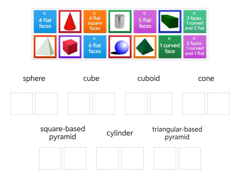 sphere: , 1 curved face, cube: , 6 flat square faces, cuboid: , 6 flat faces, cone: , 2 faces- 1 curved and 1 flat, square-based pyramid: , 5 flat faces, cylinder: , 3 faces- 1 curved and 2 flat, triangular-based pyramid: , 4 flat faces,