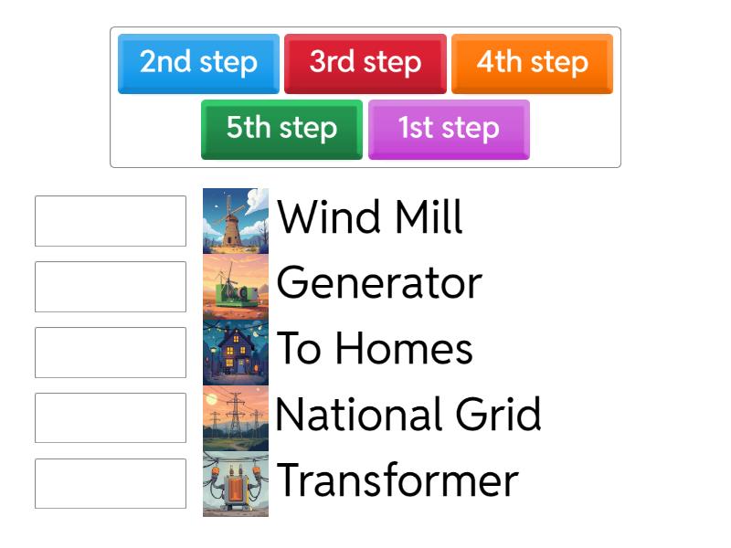 3rd step - Transformer, 5th step - To Homes, 4th step - National Grid, 1st step - Wind Mill, 2nd step - Generator,
