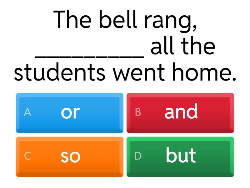 1) The bell rang, _________ all the students went home. a) or b) and c) so d) but 2) The students turned in their homework, ________ the teacher didn't grade it. a) or b) nor c) so d) but 3) Should I order a chocolate shake __________ vanilla shake? a) or b) and c) but d) so 4) Tim has one dog ________ three birds. a) or b) so c) but d) and 5) I finished my dinner,_________ I am still hungry. a) and b) so c) but d) or 6) The students can work independently, ________ they can work in groups. a) and b) but c) or d) so 7) I left school early, _________ I could go to my dentist appointment. a) so b) and c) but d) or 8) The girls went to the zoo ________ took pictures of all the animals. a) but b) and c) so d) or 9) I was so sick, ______ I had to kept working. a) but b) yet c) so d) or 10) We didn't have tickets to the concert, ____________ did I have money to buy any. a) nor b) so c) and d) yet