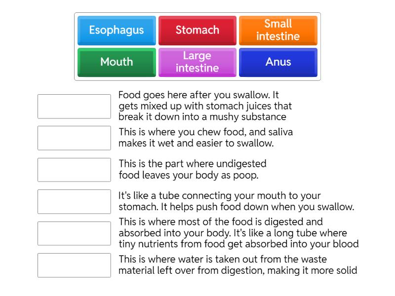 Mouth - This is where you chew food, and saliva makes it wet and easier to swallow., Esophagus - It's like a tube connecting your mouth to your stomach. It helps push food down when you swallow., Stomach - Food goes here after you swallow. It gets mixed up with stomach juices that break it down into a mushy substance, Small intestine  - This is where most of the food is digested and absorbed into your body. It's like a long tube where tiny nutrients from food get absorbed into your blood, Large intestine - This is where water is taken out from the waste material left over from digestion, making it more solid, Anus - This is the part where undigested food leaves your body as poop.,