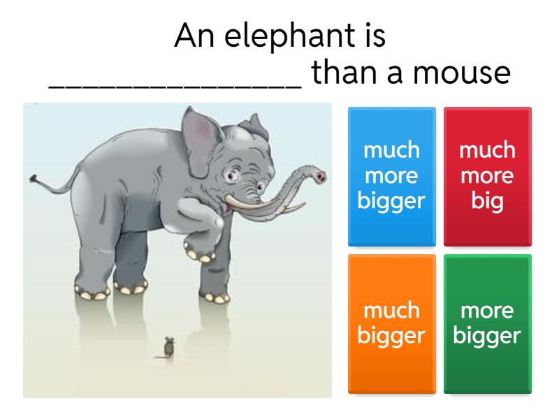 1) An elephant is _______________ than a mouse a) much more bigger b) much more big c) much bigger d) more bigger 2) A book is usually __________ than the film a) much interesting b) much interestinger c) much more interesting d) more interestinger 3) Today weather is ___________________than yesterday a) a bit gooder b) a bit better c) a bit more better d) a bit much better 4) This is ______________________ dish I have ever eaten a) most delicious b) the most delicious c) more delicious d) much delicious e) much more delicious 5) My _______________________favorite subject at school was maths a) little b) less c) lesser d) least e) list 6) This is one of _________________ days in my life a) badder b) the badest c) worst d) worse e) the worst 7) She is __________________________her father a) as intelligent as b) so intelligent as c) the same intelligent d) more intelligent e) most intelligent f) the most intelligent