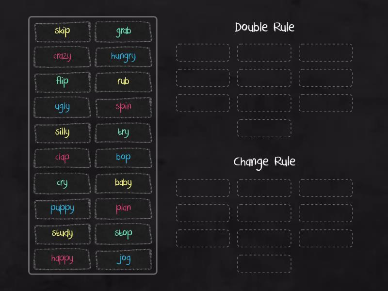 Double Rule: spin, stop, bop, flip, grab , rub, skip, plan, clap , jog, Change Rule: cry, try, study, happy, baby, puppy, ugly, hungry, silly, crazy,