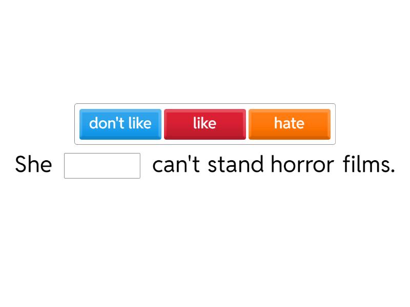 She ____ can't stand horror films. We ____ are fond of beach trips. They ____ are crazy about video games. I ____ am not a fan of classical music. They find shopping boring. ____