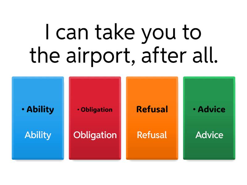 1) I can take you to the airport, after all. a) Ability b) Obligation c) Refusal d) Advice 2) May I make a suggestion? a) Obligation b) Permission c) Prohibition d) Ability 3) You can smoke in the designated area only. a) Possibility b) Obligation c) Permission d) Refusal 4) You shouldn't wear red, it doesn't suit you. a) Advice b) Refusal c) Prohibition d) Permission 5) You must obtain a visa to work in Australia. a) Possibility b) Advice c) Prohibition d) Obligation 6) You should always make an appointment. a) Obligation b) Advice c) Possibility d) Permission 7) You'll pass. Don't worry. a) Advice b) Permission c) Possibility d) Obligation 8) You mustn't walk on the grass. a) Possibility b) Prohibition c) Obligation d) Advice 9) I couldn't get through, the line was engaged. a) Ability b) Possibility c) Advice d) Refusal 10) I won't discuss the matter any further a) Permission b) Prohibition c) Advice d) Refusal