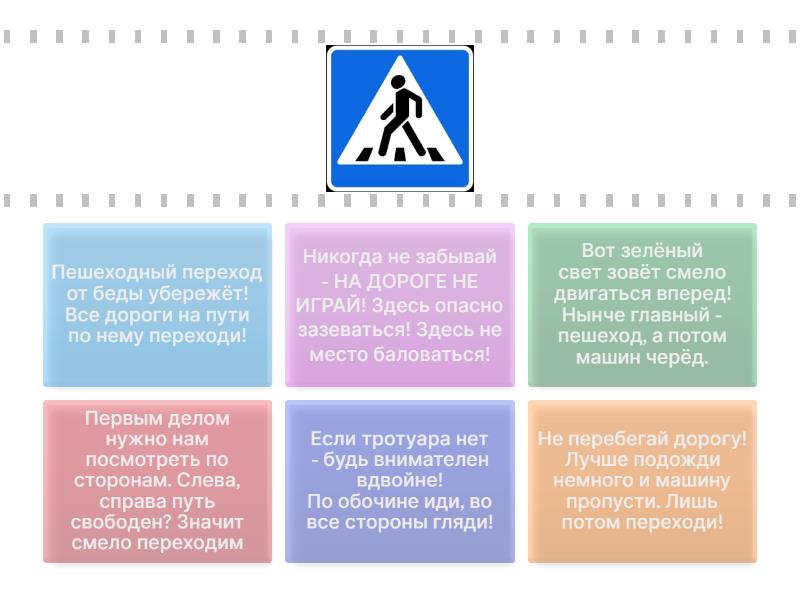 Пешеходный переход от беды убережёт! Все дороги на пути по нему переходи!, Первым делом нужно нам посмотреть по сторонам. Слева, справа путь свободен? Значит смело переходим, Не перебегай дорогу! Лучше подожди немного и машину пропусти. Лишь потом переходи!, Вот зелёный свет зовёт смело двигаться вперед! Нынче главный - пешеход, а потом машин черёд., Никогда не забывай - НА ДОРОГЕ НЕ ИГРАЙ! Здесь опасно зазеваться! Здесь не место баловаться!, Если тротуара нет - будь внимателен вдвойне! По обочине иди, во все стороны гляди!,