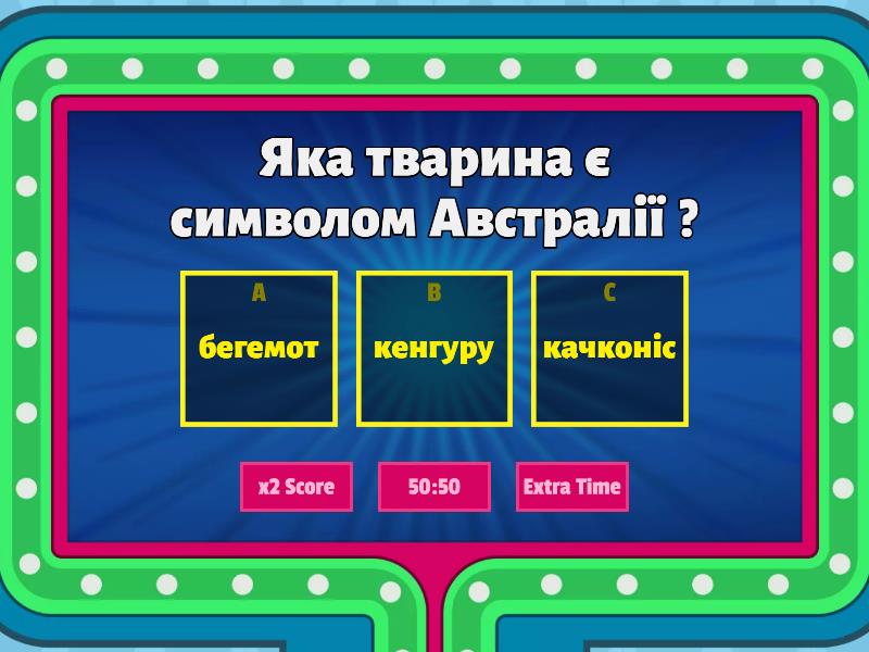 1) Яка тварина є символом Австралії ? a) бегемот b) кенгуру c) качконіс 2) Австралія знаходиться в таких півкулях... a) Південна і Східна b) Північна і Західна c) Північна і Східна 3) Обери океани, які омивають Австралію. a) Тихий і Північно-льодовитий b) Тихий, Індійський і Південний c) Атлантичний і Індійський 4) Які острови знаходяться поруч з Австралією ? a) Тасманія і Гренландія b) Мадагаскар і Нова Гвінея c) Тасманія і Нова Гвінея 5) Які природні зони переважають на материку a) Пустелі і савани b) Тропічі ліси і лісостеми c) Савани і тропічні ліси 6) Скільки держав існує в Австралії a) 1 b) 2 c) 5 7) Яка держава існує a) Африканський союз b) Австралійський союз c) Австралійська об'єднана держава