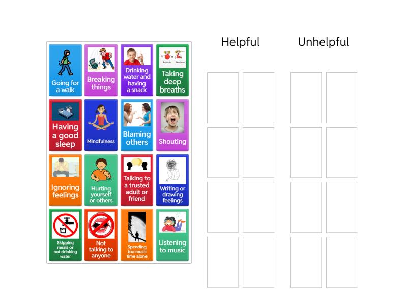 Helpful: Taking deep breaths, Going for a walk, Talking to a trusted adult or friend, Listening to music, Writing or drawing feelings, Drinking water and having a snack, Mindfulness, Having a good sleep, Unhelpful: Shouting, Breaking things , Ignoring feelings , Hurting yourself or others, Not talking to anyone, Skipping meals or not drinking water, Spending too much time alone, Blaming others,