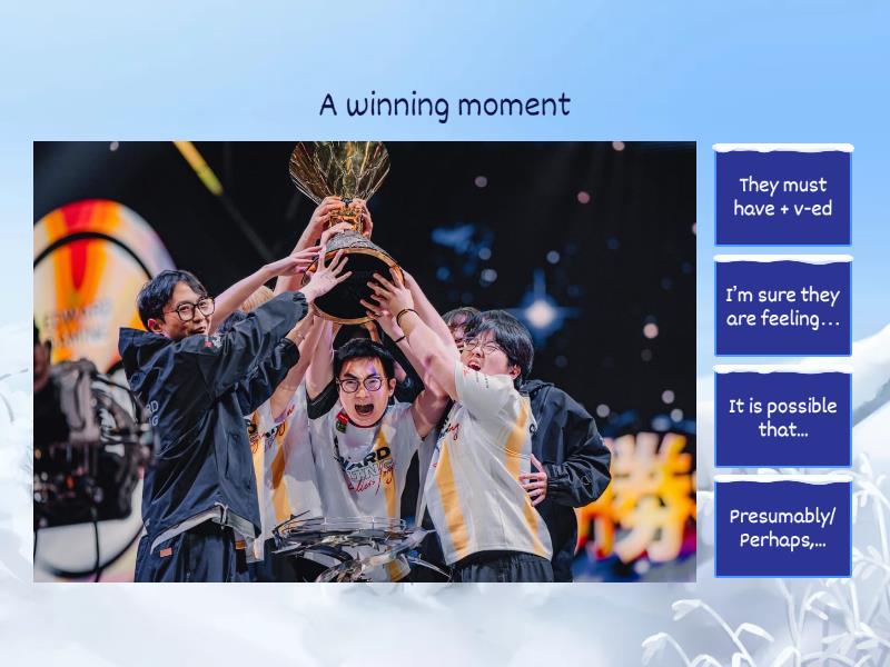 1) A winning moment  a) They must have + v-ed b) I’m sure they are feeling… c) It is possible that... d) Presumably/ Perhaps,... 2) An adventure sport a) He/She could be + verb-ing b) Possibly, the person is... + verb-ing c) I get the impression that... d) It seems to me that... 3) A class discussion a) They could be + verb-ing... b) Possibly, they are... + verb-ing c) I get the impression that... d) It seems to me that... 4) Being courteous (=polite) a) They might be + verb-ing... b) Perhaps, they are... + verb-ing c) I get the impression that... d) It seems to me that... 5) Relaxing in nature a) He might be + verb-ing... b) He could have + verb-ed c) I have the feeling that... d) It appears to me that... 6) A family reunion a) They could/might be + verb-ing... b) I can see that... c) I have the feeling that... d) It appears to me that... 7) A music lesson a) They might be + verb-ing... b) They must feel... c) I have the feeling that... d) It appears to me that... 8) A traditional festival a) They might be + verb-ing... b) They must feel... c) I have the feeling that... d) It appears to me that...