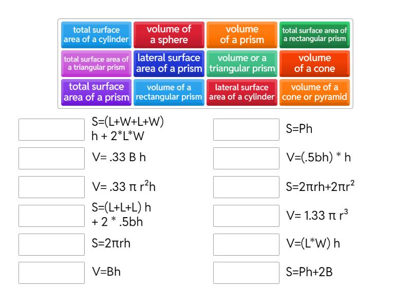 total surface area of a prism - S=Ph+2B, lateral surface area of a prism - S=Ph, lateral surface area of a cylinder - S=2πrh, total surface area of a cylinder - S=2πrh+2πr², volume of a prism - V=Bh, total surface area of a triangular prism - S=(L+L+L) h + 2 * .5bh  , total surface area of a rectangular prism - S=(L+W+L+W) h + 2*L*W, volume of a rectangular prism - V=(L*W) h, volume or a triangular prism - V=(.5bh) * h, volume of a cone or pyramid - V= .33 B h, volume of a cone - V= .33 π r²h, volume of a sphere - V= 1.33 π r³,