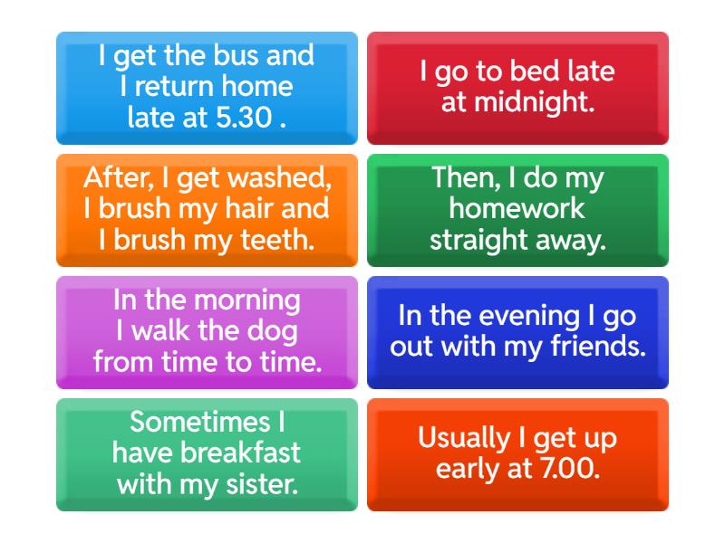 Usually I get up early at 7.00. - D'habitude, je me léve tôt à sept heures., After, I get washed, I brush my hair and I brush my teeth. - Puis, je me lave, je me peigne et je me brosse les dents., Sometimes I have breakfast with my sister. - Parfois, je prends le petit déjeuner avec ma soeur., In the morning I walk the dog from time to time. - Le matin je promène le chien de temps en temps., I get the bus and I return home late at 5.30 . - Je prends le bus et je rentre à la maison tard à dix-sept heures et demie., Then, I do my homework straight away. - Puis je fais mes devoirs tout de suite., In the evening I go out with my friends. - Le soir je sors avec mes amis., I go to bed late at midnight. - Je me couche tard à minuit.,