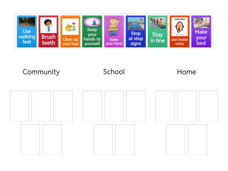 Community: Stop at stop signs , School: Raise your hand, Keep your hands to yourself , Use walking feet, Use inside voice , Stay in line , Home: Make your bed, Clean up your toys , Brush teeth ,