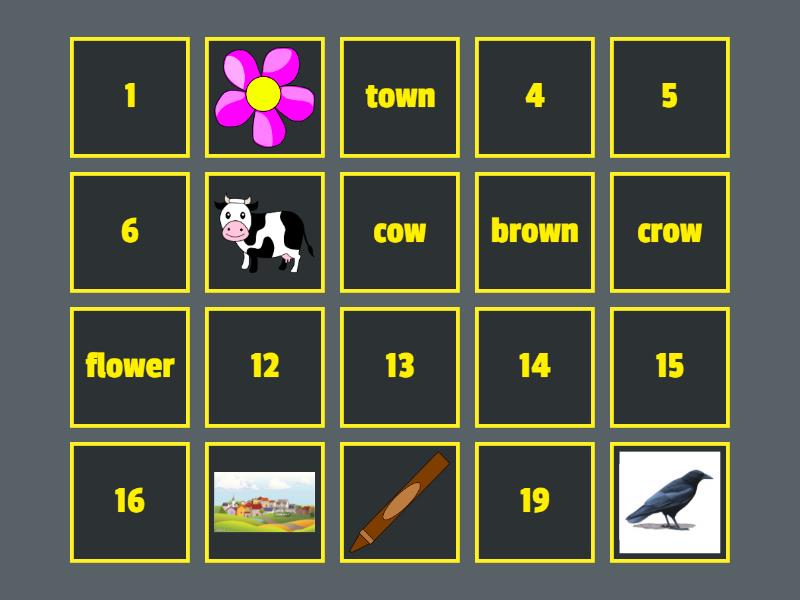 crow, brown, cow, town, flower, shower, snow, crown, grow, glow,